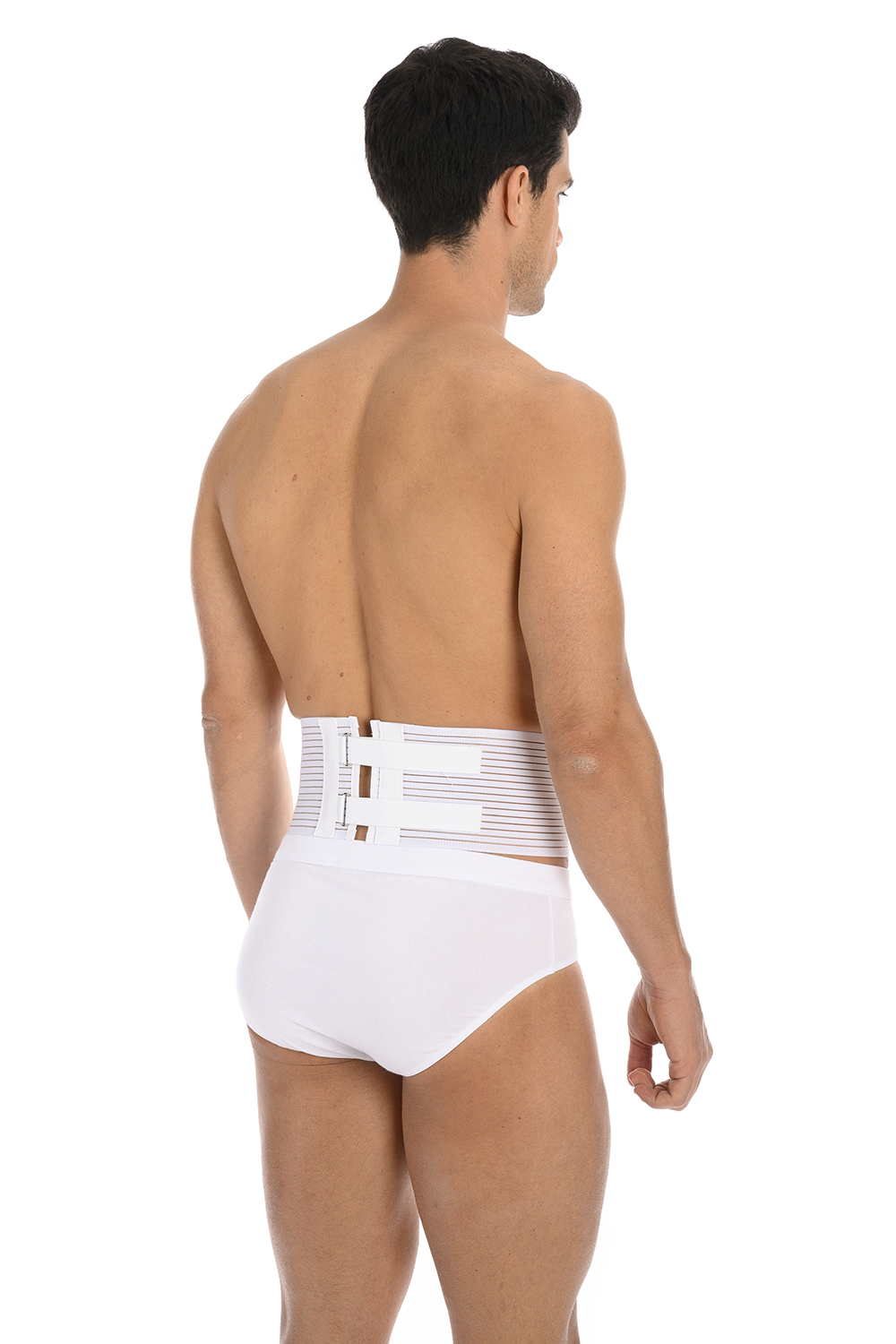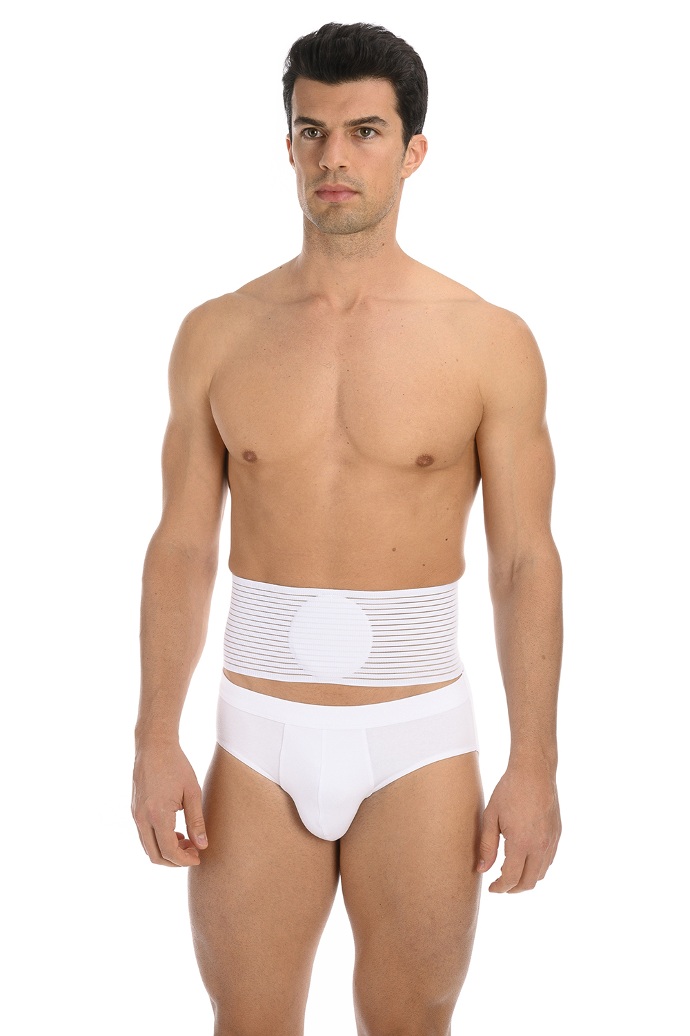 Cinto erniario ombelicale per ernia in tessuto traspirante con applicata placca imbottita e ricoperta in puro cotone.