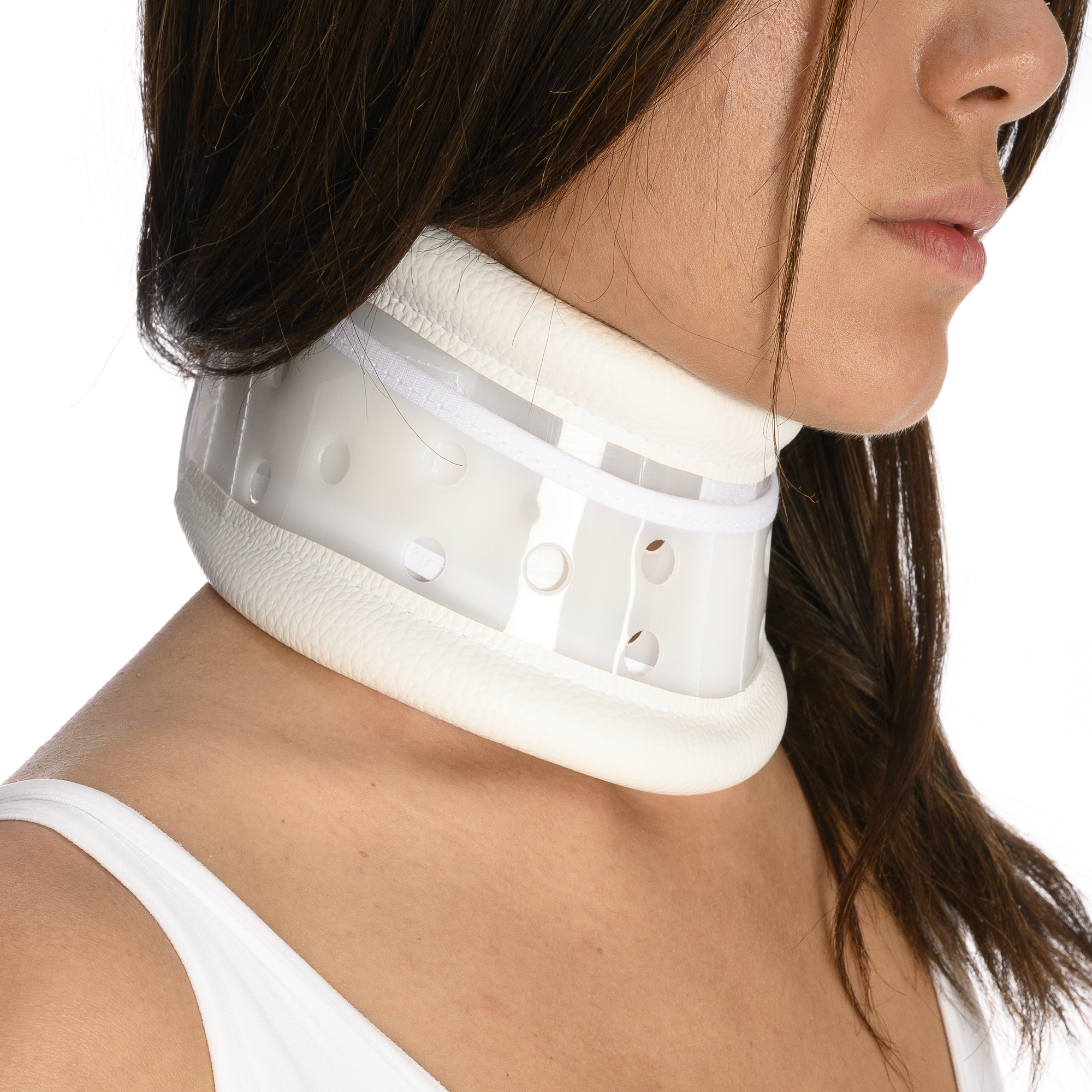 Costituito da due segmenti in materiale plastico flessibile anatomicamente sagomati, tra loro sovrapponibili in modo da poter adeguare l’altezza del collare alle esigenze dell’ utilizzatore.