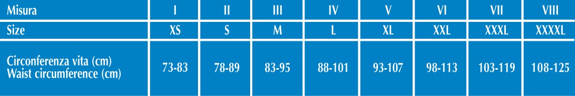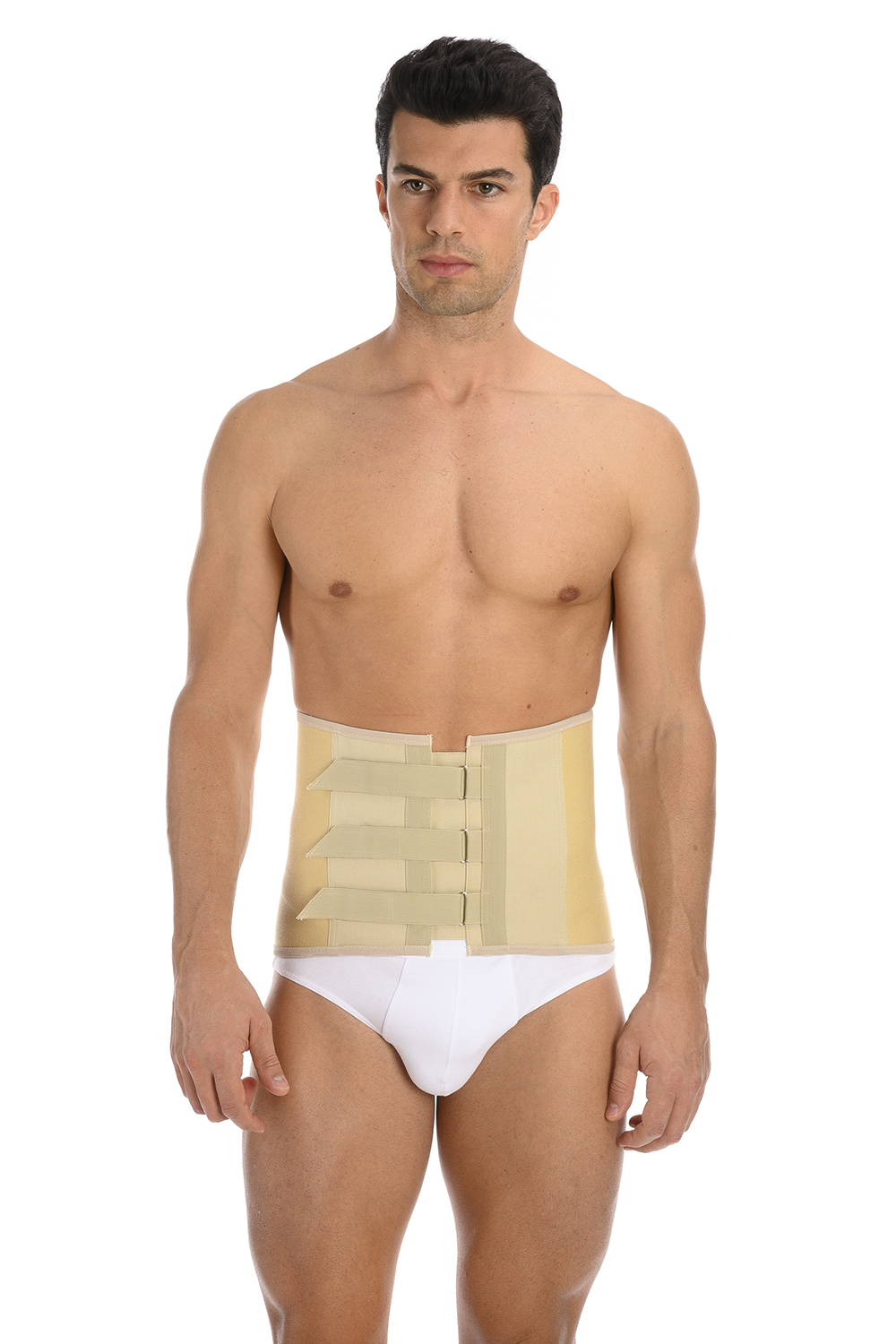 Dotato di stecche addominali flessibili antiarrotolamento e chiusura anteriore regolabile mediante tiranti con fibbie.