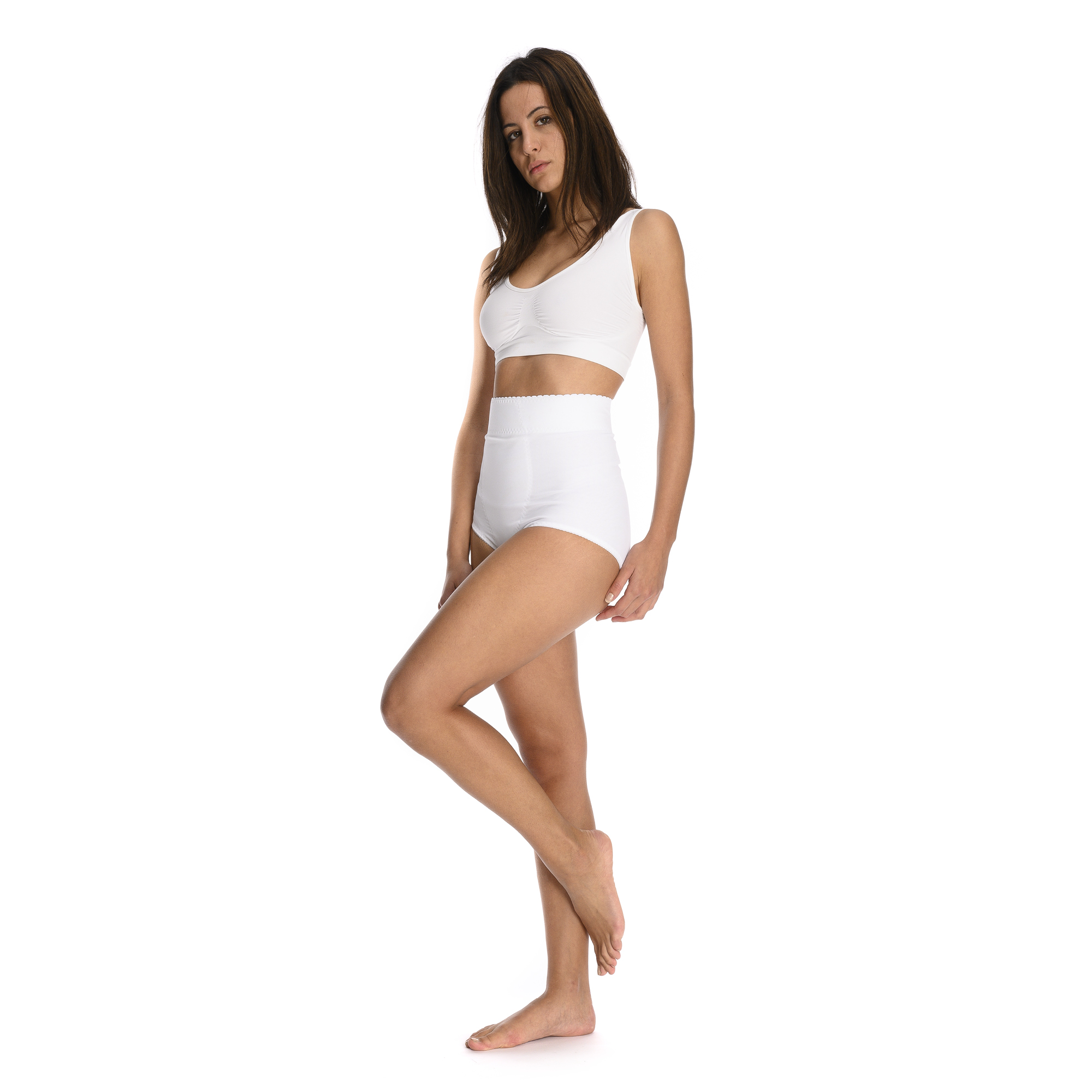 Guaina fortemente contenitiva, con fascia sostenitiva alzabusto, anatomico girogamba, completamente foderata con tessuto elastico con il cotone sulla pelle.
