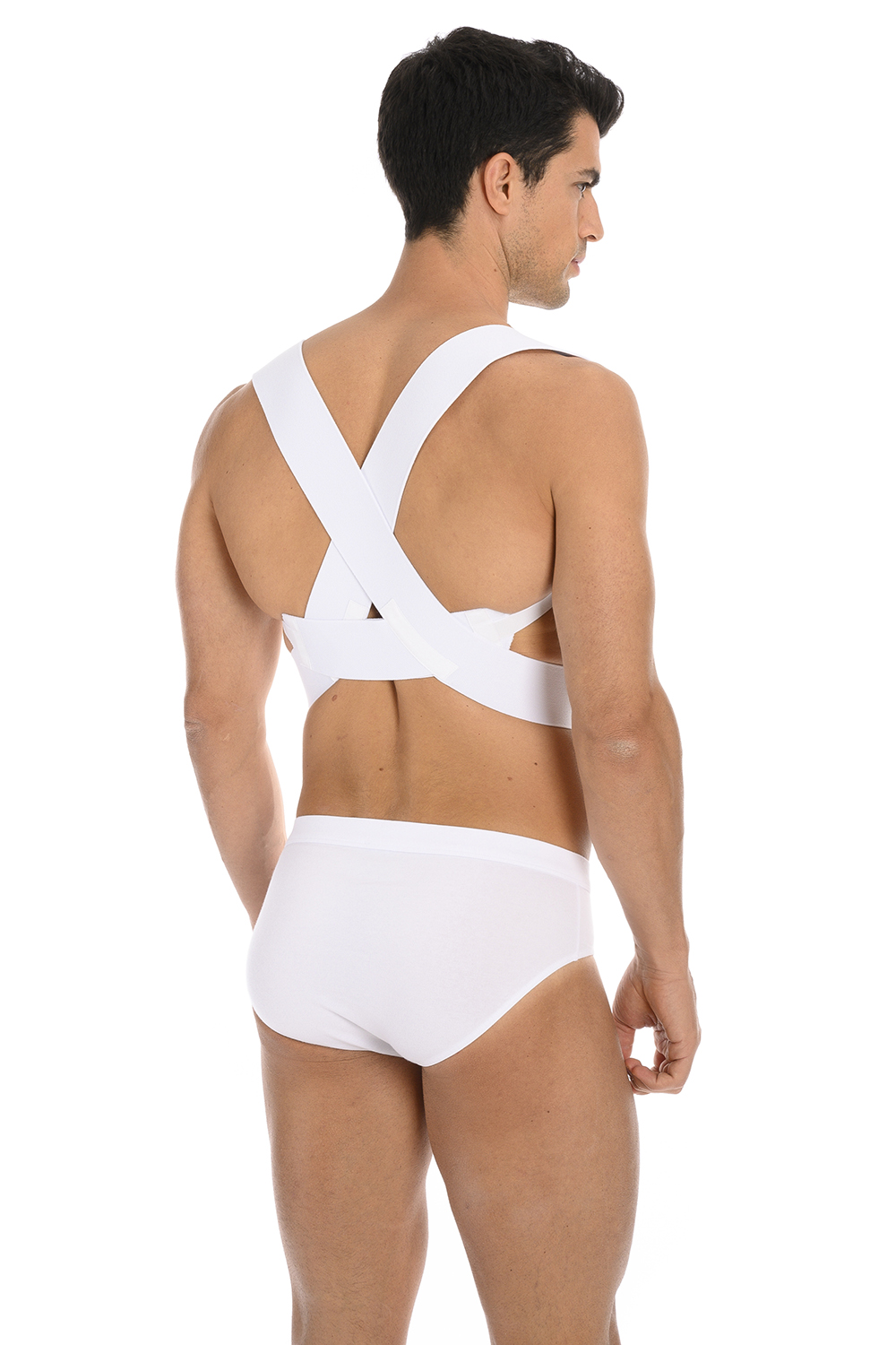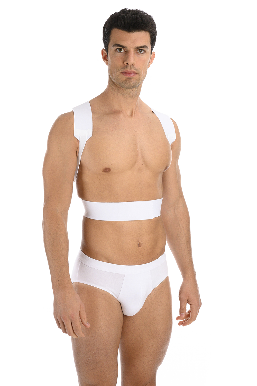 Raddrizzaspalle anatomico regolabile anteriormente che assicura, mediante l’incrocio di fasce elasticizzate, un efficace sostegno del busto così da sollecitare un allineamento del rachide.